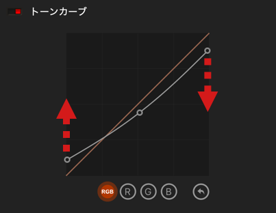 - 左下/右上のハンドルは、それぞれ画像のブラックレベルとホワイトレベルを設定します。