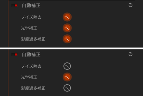 自動補正パレット内には、それぞれの補正に対応するボタンが表示されますが、画像形式によって DxO FilmPack で自動補正されるものが変わるため、表示されるボタンの種類も変わります。 ボタンをクリックすることで、自動補正を有効にしたり、無効にしたりできます。