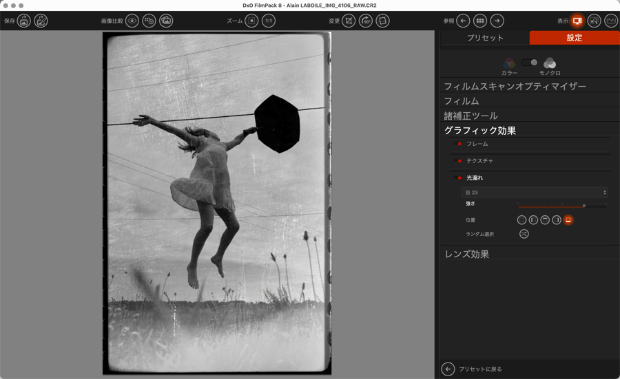 光漏れツールではエッジ部分に問題を発生させ、時間が経過してしまった写真や、フィルムカートリッジから光が漏れた露出事故を演出することができます。