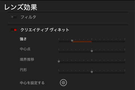 - 中心を設定する:画像内の中心となる主題にあわせて、ヴィネット効果の中心点を設定することができます。