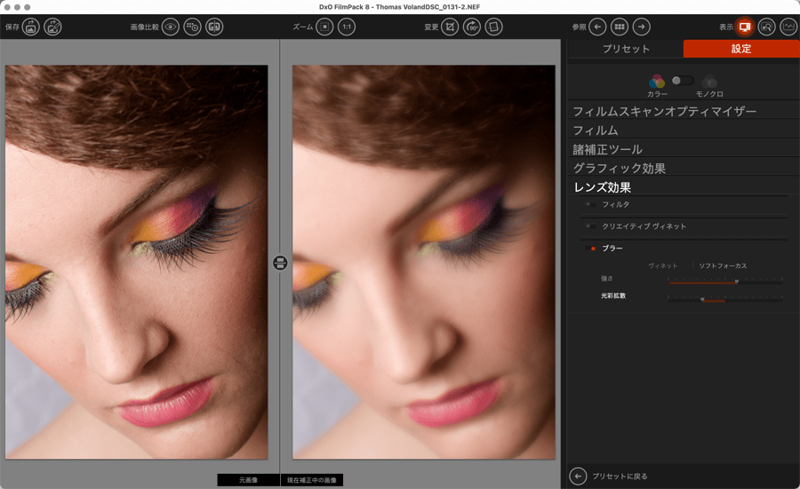 DxO FilmPack では効果の中心位置を画像内の主題に合わせて移動することができます。