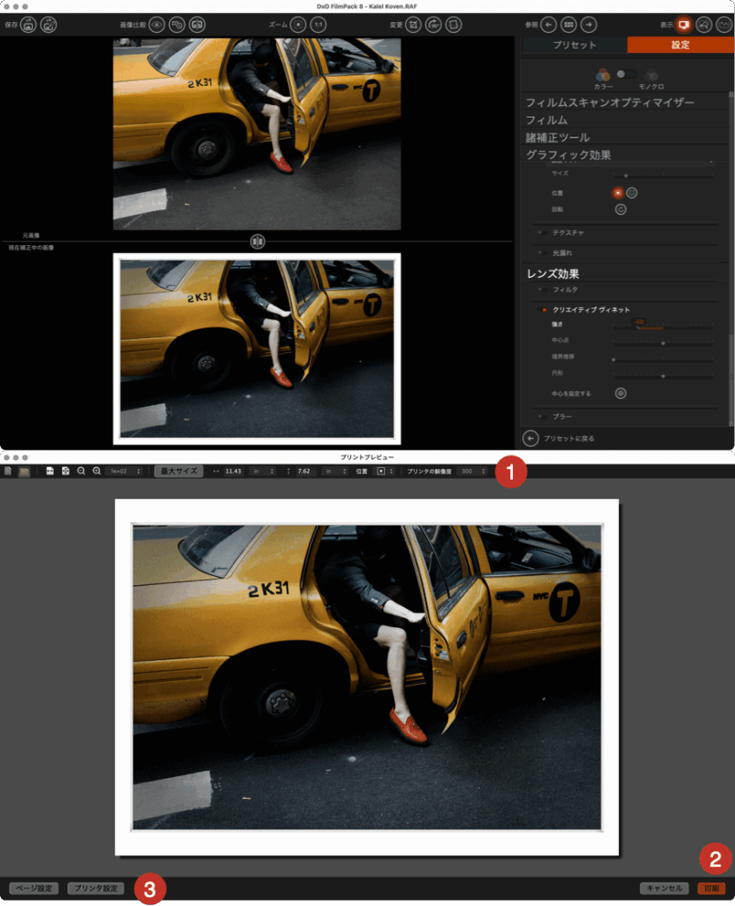 DxO FilmPack のスタンドアロン版とプラグイン版から、直接写真をプリントすることができます。 プリントウィンドウを開く方法は 3 つ用意されています。