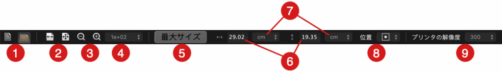 - . 上部ツールバー:向きやサイズ、位置、解像度などを設定します。