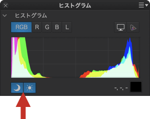 - シャドウのクリッピング: このアイコンをクリックすると、暗いエリアで情報が残っていない領域を色で表示します。